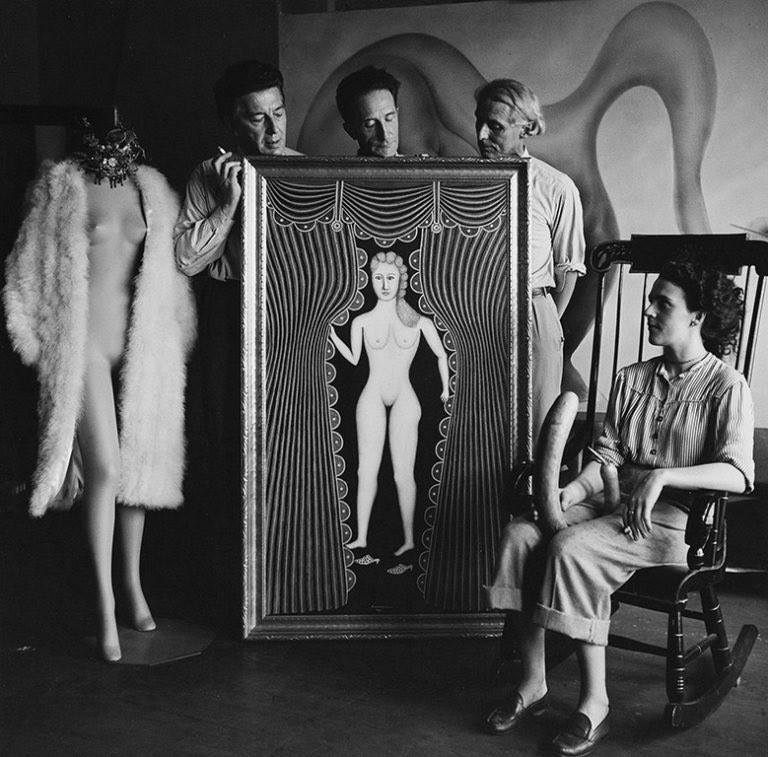 Leonora Karington, Andre Breton, Marsel Dišan i Maks Ernst, Njujork, 1942; fotografija Hermana Landšofa. U centru je slika Morisa Hiršfilda. „Naga žena na prozoru” (Nude at the Window, 1941).
